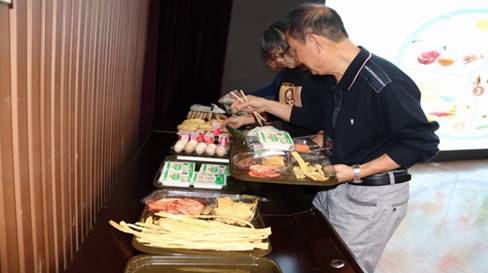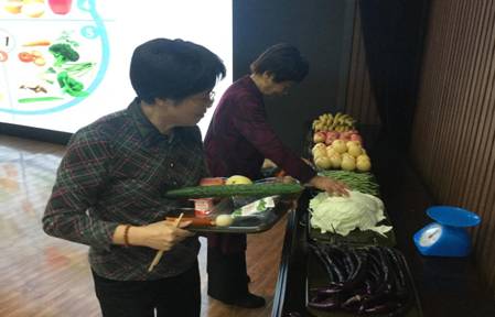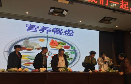 别具匠心的一个环节来了,内分泌科医务人员有序的将我们日常吃的瓜果蔬菜肉蛋米面等一一搬上台。将积极参与前面环节活动的糖友们分三组请到台上,一人一餐盘,让其在规定时间内自选一天所需的食物。然后请钱如如营养师做一一点评。通过具体的实践来深刻记忆饮食相关知识,走出饮食误区。糖友们纷纷表示在这闲散的时光里汲取了糖尿病相关知识。